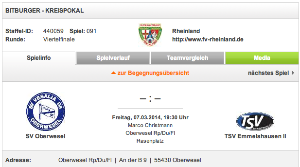 Am Freitag, 07.03.2014 ist es soweit, die erste Mannschaft der Vesalia bestreitet das erste Pflichtspiel im Jahr 2014. Gegner im Viertelfinale des Kreispokals ist der TSV Emmelshausen II. Eine Woche später (16.3 um 14.45 Uhr) empfängt man dann ebenfalls in einem Heimspiel die SG Laudert im Auftakt der Kreisliga A. Derzeit wird der Rasenplatz im Rhinelander Stadion von Platzwart Christof Persch hergerichtet, so dass hoffentlich gespielt werden kann. Das frühlingshafte und meist sonnige gemeldete Wetter gibt aber Hoffnung, dass die Spiele in Oberwesel stattfinden können.