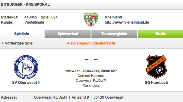 Die Auslosung für das Kreispokal-Halbfinale wird während der Halbzeit (ca. 20.45 Uhr) des Pokalspiels SV Oberwesel II gegen SG Hambuch am Mittwoch, 26.3. in Oberwesel vorgenommen.